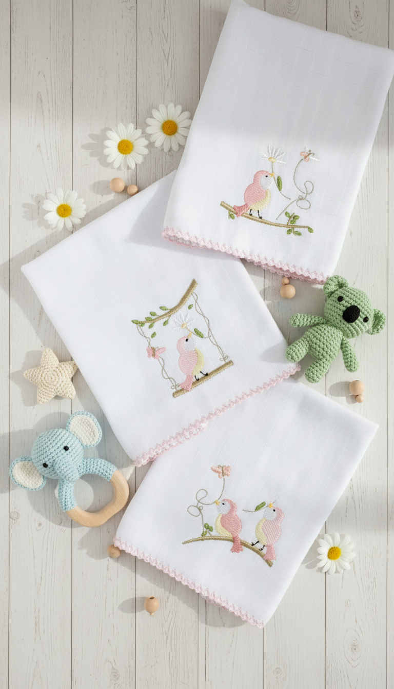 Fraldinha de boca, bordada e com acabamento em picueta.